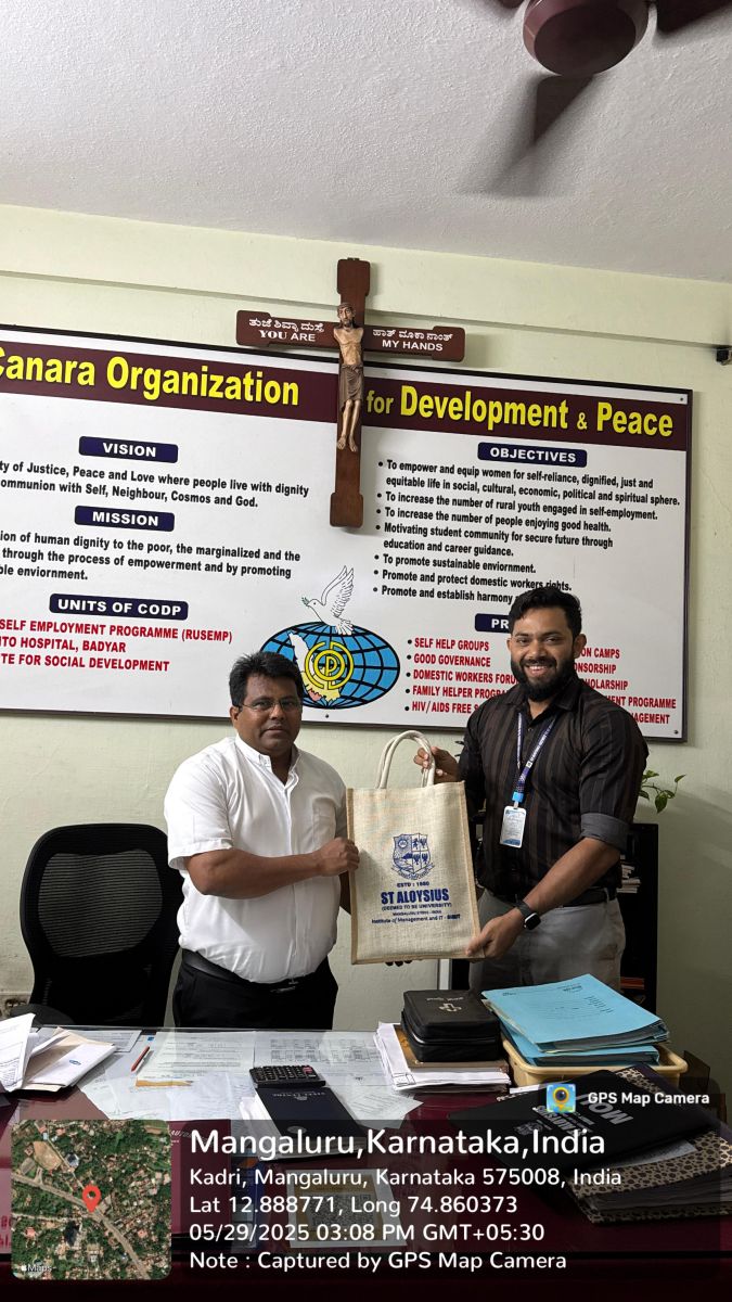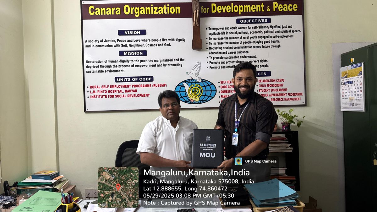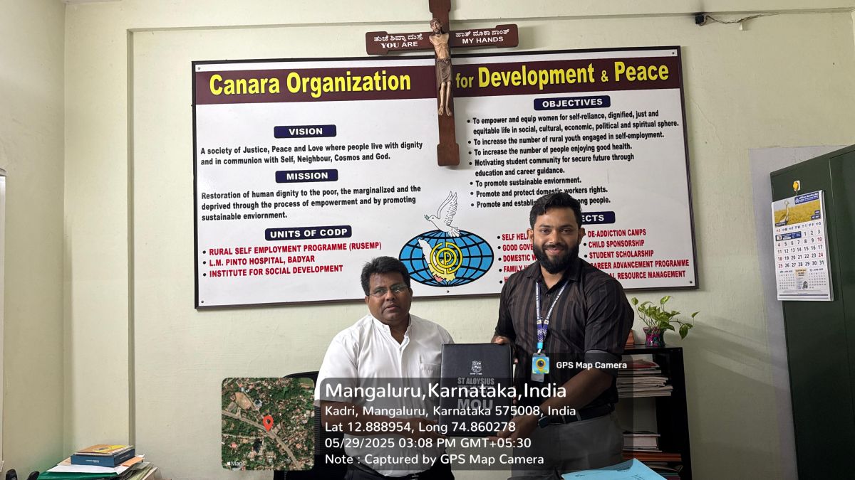On 29th May 2025, the AIMIT Centre of St Aloysius (Deemed to be University) signed a Memorandum of Understanding (MoU) with Canara Organization for Development and Peace (CODP), Mangalore, to enhance practical learning and community involvement among MBA students. This partnership focuses on exposing students to labour welfare schemes, especially the Karmik Card initiative for construction workers, and broader community development activities.