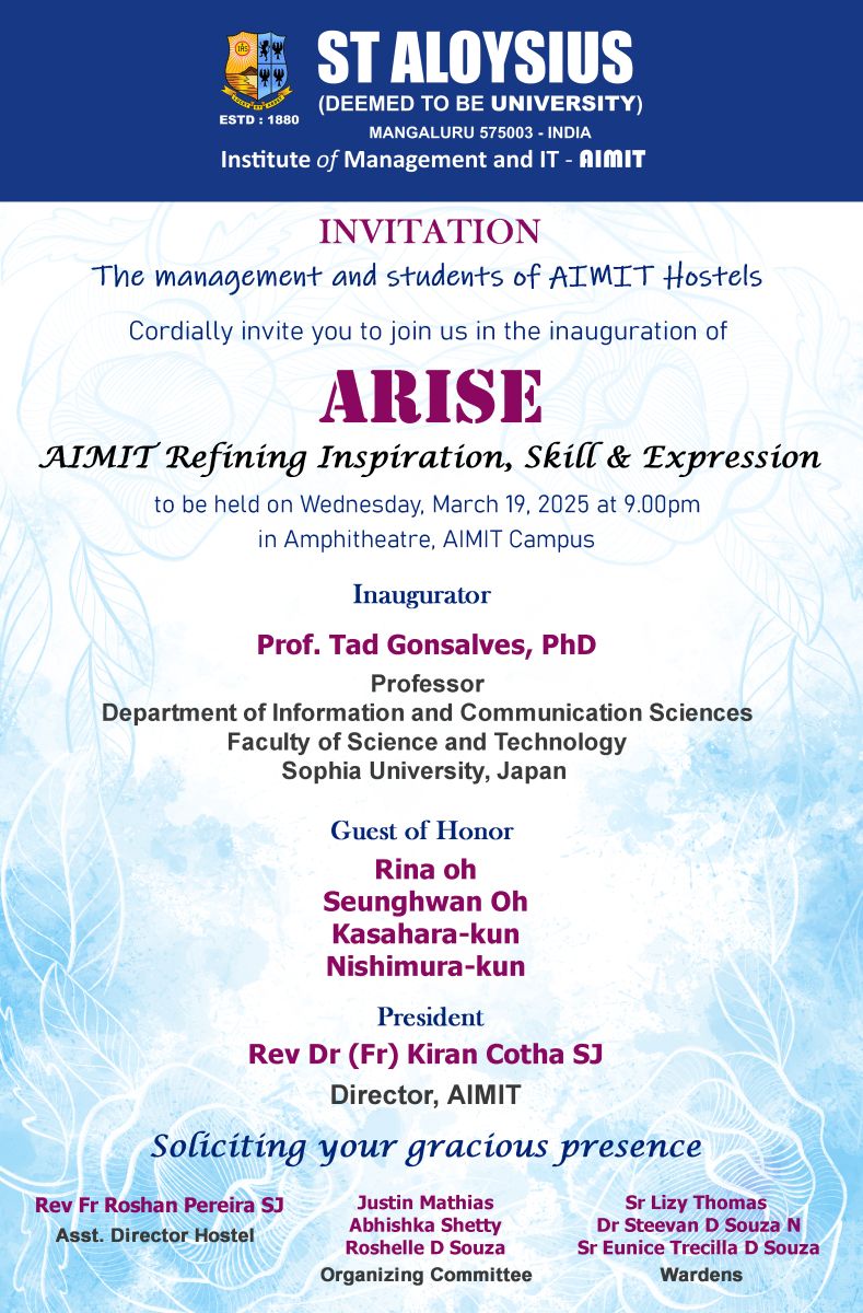 In the absence of Prof. Tad Gonsalves from Sophia University, Japan, the honor of inaugurating the program was bestowed upon Dr. Rina Oh from Japan. She expressed admiration for India’s rich cultural heritage and traditions, extending her warm wishes for the success of ARISE. The event was graced by the presence of Dr. Fr. Kiran Cotha SJ, Director of AIMIT Centre, who emphasized the significance of ARISE as a beacon of awakening and unity. He encouraged students from Loyola Boys Hostel, Gonzaga Girls Hostel, and Mother Teresa Girls Hostel to come together, celebrate their talents, and strengthen their bonds. The program was witnessed by the Assistant Director of the Hostel Fr Roshan Pereira SJ, the sub Warden Fr Avinash D Souza SJ, Wardens Sr Lizy Thomas, Sr Euncie Trecilla D Souza, Dr Steevan D Souza N, teaching and non-teaching members and students of the AIMIT Centre hostel were present.