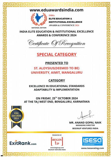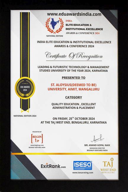 Based on these criteria’s they have awarded St. Aloysius (Deemed to be) University, AIMIT Centre, Mangaluru, “Leading & Futuristic Technology & Management Studies University of the Year 2024” Karnataka Award under “Quality Education, Excellent Administration & Placement” Category for the year 2024. And, our Institute is also selected to receive another award under the category “Excellence in Educational Standards Adaptability & Implementation”.
