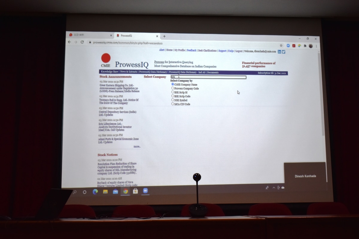 In the following sessions, Dinesh Konhada explained how to use ProwessIQ software and analyse financial statements. Sumitha Achar spoke about problem centred research and explained about problem identification, problem formulation and problem specification with relevant examples and a power point presentation.