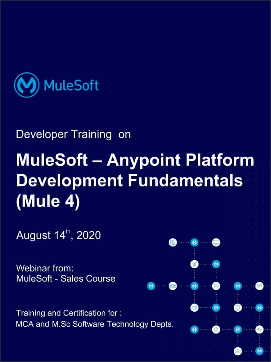 A series of MuleSoft Developer Training programmes were held by MuleSoft for the MCA and M.Sc Software Technology students of St Aloysius College (Deemed to be University), AIMIT Centre, Beeri, Mangalore. The first on campus training programme was held for a week from March 2-7. The remaining two batches had the week long workshops online in the Month of May and June 2020. The students who have completed the training programme are now enrolled in the global certification process from MuleSoft-Salesforce, leading Analytics platform. On August 14, 2020 a one-day webinar was organised by MuleSoft development team to train all the IT graduates on the MuleSoft University LMS platform.